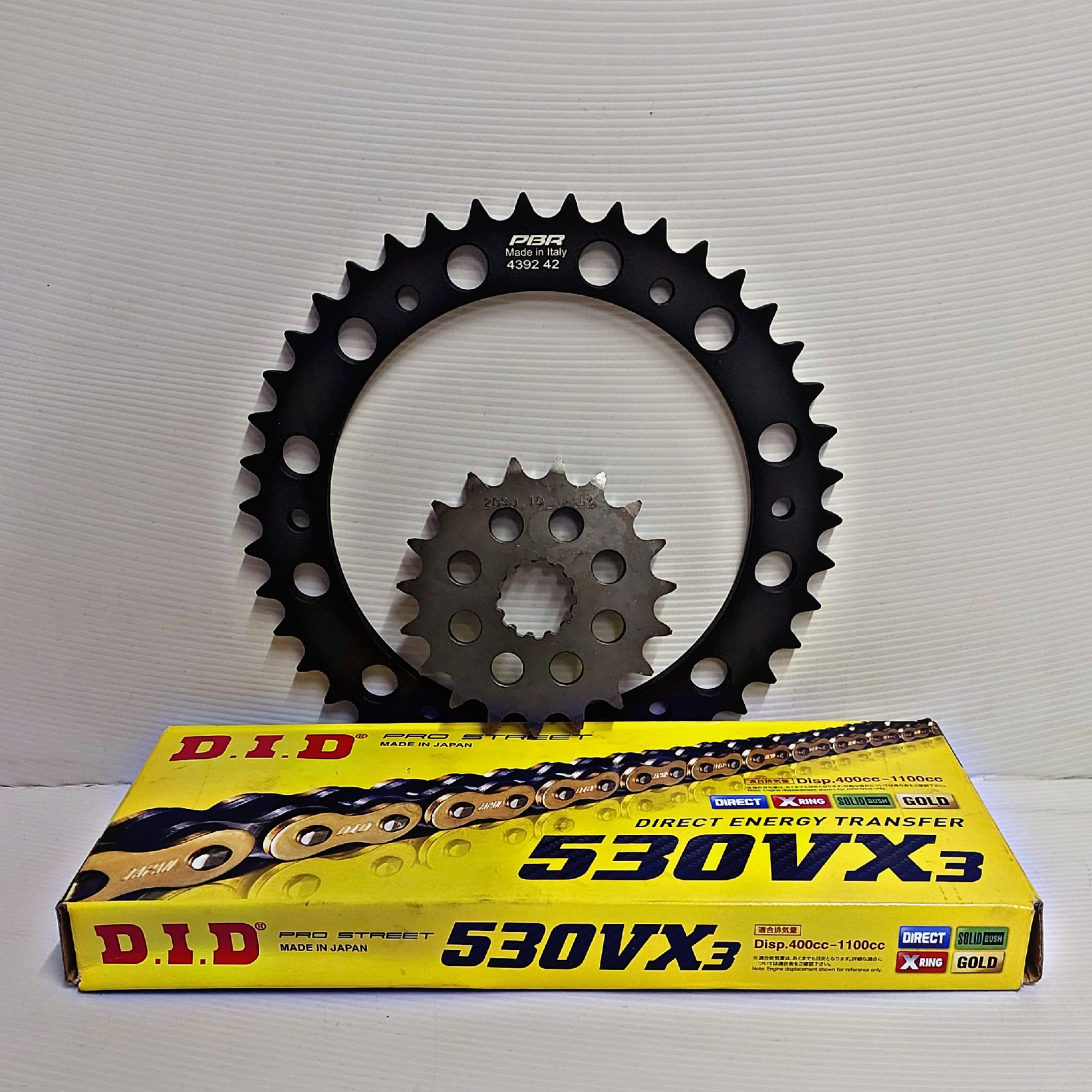 Top quality front and rear sprockets from JT, PBR and CHT matched with top quality Japanese brand DID O’ring and X’ring chains