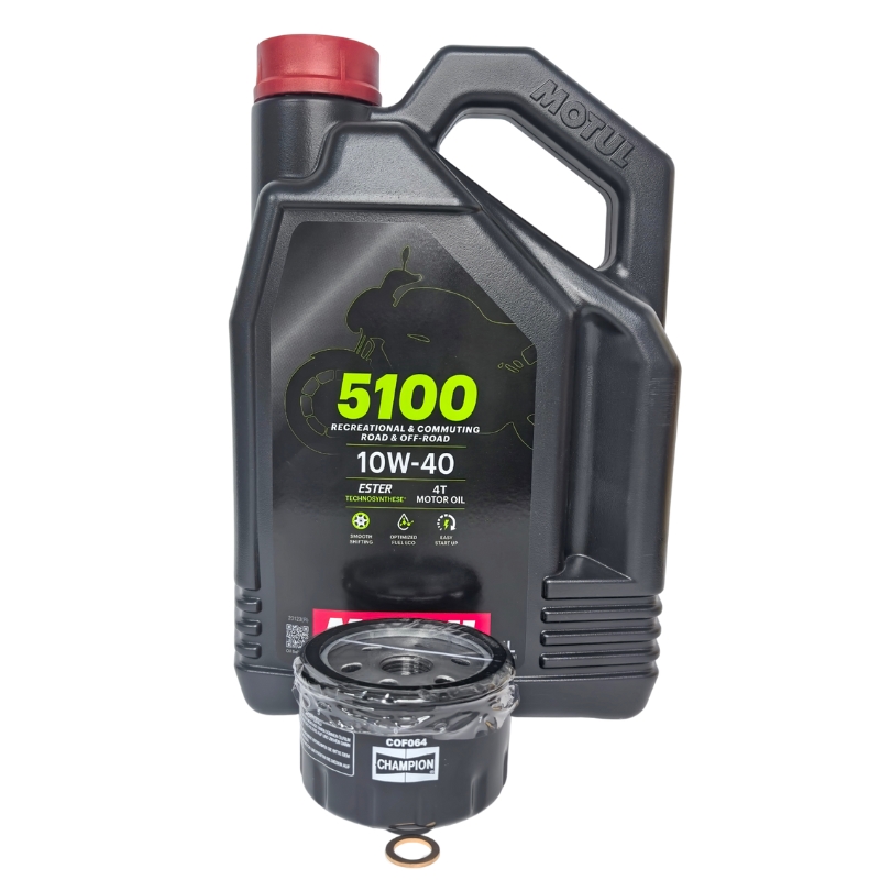 1 x Champion COF064 oil filter, 4 litres Motul 5100 10W40 Semi Synthetic Oil, 1 x copper sump plug washer