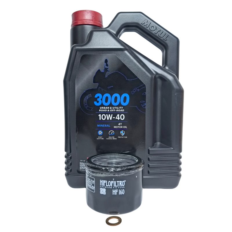 1 x Hiflo Filtro HF160 oil filter, 4 litres Motul 3000 10W40 mineral oil, 1 x copper sump plug washer