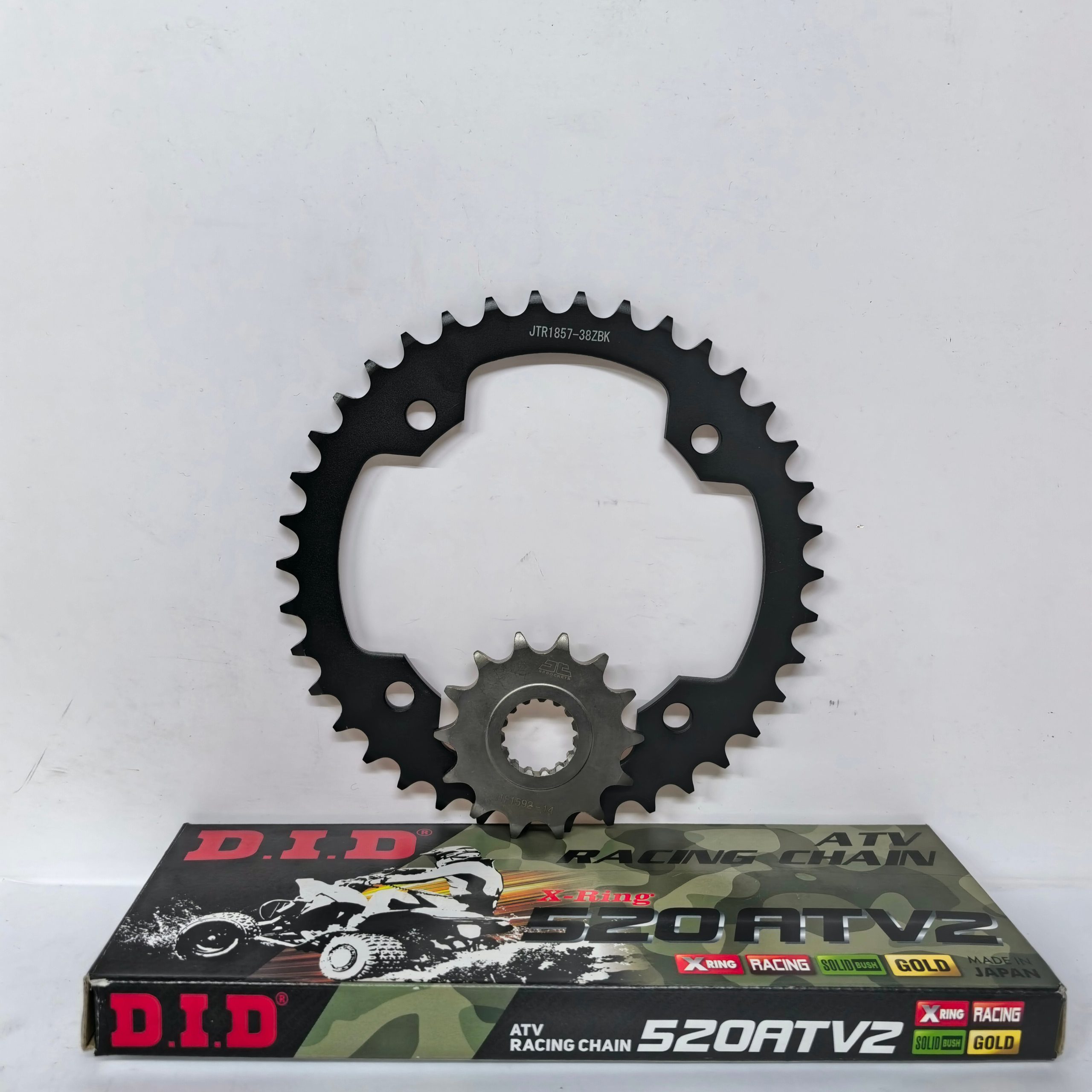 Top quality front and rear sprockets from Airtime, Emgo and JT matched with a top quality Japanese brand DID 520 ATV Racing X’ring chain